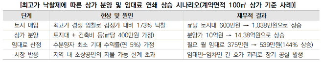 2. ºñ¿ë Ãø¸é : "ÃÖ°í°¡ ³«ÂûÁ¦"°¡ Ã˹ßÇÑ °íºÐ¾ç°¡¿Í °úÀ× °ø±Þ, ÀÓ´ë·á ÇÏ¹æ°æÁ÷¼º - °ø°øÀÇ ÅäÁö °ø±Þ ¹æ½Ä¿¡ µû¸¥ "°íºñ¿ë ±¸Á¶"·Î, ÀÌ´Â »ó±Ç Çü¼ºÀ» ¿øÃµÀûÀ¸·Î °¡·Î¸·´Â ÁøÀÔ À庮À¸·Î ÀÛ¿ëÇÔ - ¼öÀͼº ±Ø´ëÈÀÇ ºÎÀÛ¿ë : LH ¹× ÁöÀÚü »êÇÏ µµ½Ã°³¹ß°ø»ç´Â »ó¾÷¿ëÁö¸¦ ¹Î°£¿¡ ¸Å°¢ÇÒ ¶§ ´ëºÎºÐ "ÃÖ°í°¡ °æÀï ÀÔÂû" ¹æ½ÄÀ» ÃëÇÔ. ÇÙ½É ÀÔÁö¸¦ È®º¸ÇÏ·Á´Â ½ÃÇà»ç µîÀÇ ÃâÇ÷ °æÀïÀ¸·Î ÀÎÇØ ÅäÁö ³«Âû°¡´Â °¨Á¤Æò°¡¾×ÀÇ 150%¿¡¼ ½ÉÇϰԴ 200% ÀÌ»ó±îÁö ÆøµîÇÔ - ¿¹°ßµÈ °ø½ÇÀÇ ¾Ç¼øÈ¯ : ½ÃÇà»ç´Â ºñ½Î°Ô ¸ÅÀÔÇÑ ÅäÁö ´ë±Ý°ú Ä¡¼ÚÀº °Ç¼³ ¿ø°¡, PF ±ÝÀ¶ ºñ¿ëÀ» ȸ¼öÇϱâ À§ÇØ »ç¾÷ ¼öÁö¸¦ ¹«¸®ÇÏ°Ô ¸ÂÃß¸ç ºÐ¾ç°¡¸¦ ±ØÇÑÀ¸·Î ²ø¾î¿Ã¸²(ÀÌ¿Í ´õºÒ¾î, »ç¾÷ ¼öÁö¸¦ ¸ÂÃß±â À§ÇØ °úµµÇÑ »ó°¡ ±Ô¸ð Ã¥Á¤µµ ¼ö¹ÝµÇ±âµµ ÇÔ). À̸¦ ºÐ¾ç¹ÞÀº ¼öºÐ¾çÀÚ(°Ç¹°ÁÖ)´Â ÀÚ½ÅÀÇ ÅõÀÚ ¿ø±Ý°ú ´ëÃâ ÀÌÀÚ¸¦ Ãæ´çÇϱâ À§ÇØ, Áö¿ª »ó±ÇÀÇ ÁöºÒ ´É·ÂÀ» ¶Ù¾î³Ñ´Â "Ãʰí¾× ÀÓ´ë·á"¸¦ Ã¥Á¤ÇÏ°Ô µÊ - ÀÚ»ê °¡Ä¡ ¹æ¾î¸¦ À§ÇÑ °ø½Ç °¨¼ö : »ó¾÷¿ë ºÎµ¿»êÀº "ÀÓ´ë ¼öÀÍ·ü"·Î ÀÚ»ê °¡Ä¡°¡ Æò°¡(¼öÀÍȯ¿ø¹ý)µÇ¹Ç·Î ¿ù¼¼¸¦ ³»¸®´Â ¼ø°£ »ó°¡ÀÇ ¸Å¸Å°¡¾×ÀÌ µ¿¹Ý Ç϶ôÇϰí, ÀÌ´Â ÀºÇàÀÇ ´ãº¸´ëÃâ ¿¬Àå °ÅºÎ³ª ¸¶ÁøÄÝ·Î À̾îÁü. µû¶ó¼ °Ç¹°ÁÖµéÀº ´çÀåÀÇ ÀÌÀÚ ºÎ´ãÀ» °¨¼öÇÏ´õ¶óµµ ¸í¸ñ ÀÓ´ë·á¸¦ ³»¸®Áö ¾Ê´Â "ÀÓ´ë·á ÇÏ¹æ°æÁ÷¼º"ÀÇ µô·¹¸¶¿¡ ºüÁö¸é¼ »ó°¡´Â ¹æÄ¡µÊ